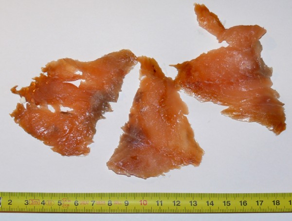Dnes jsem zakoupil v Tescu "značkové" zboží Tesco - 100g uzené lososové plátky za 95.- Kč. Musím uznat že obal byl velmi pěkný, na lakovaném papíře, dokonce s ukázkou servírování. Ale kdybych se pokusil z toho, co bylo v obalu, provést kreaci, která je tam vyfotografována, všichni, kteří by měli být pohoštěni, by po několika dnech mého marného snažení zemřeli hlady. Z překrásné krabičky místo růžových plátků lososa vypadly nevábné potrhané dvoubarevné zbytky velmi malých rozměrů. Vypadá to, jako by Tesco mělo smlouvu s nějakou restaurací, kde z lososových plátků odkrajují to, co si netroufnou dát svým hostům, a to pak Tesco balí pro své zákazníky. Podívejte se sami. Fuj.